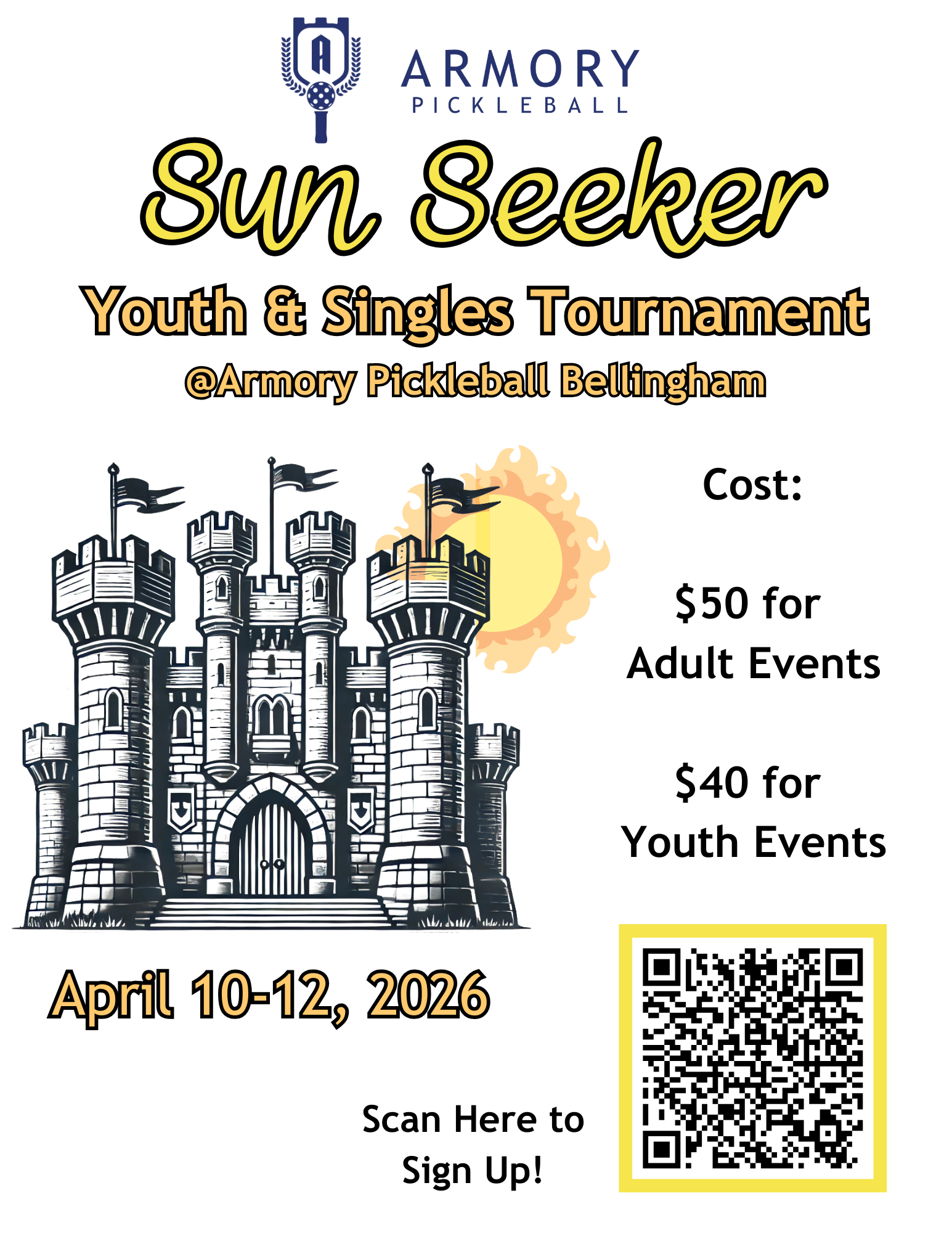 Join us at Armory Pickleball Bellingham for our fourth annual Sun Seeker Tournament, April 10-12, 2026! We encourage everyone to stop by and cheer on the next generation of players, especially our local kids who've been building their skills in the Armory Youth Program. A full schedule for the weekend is below!